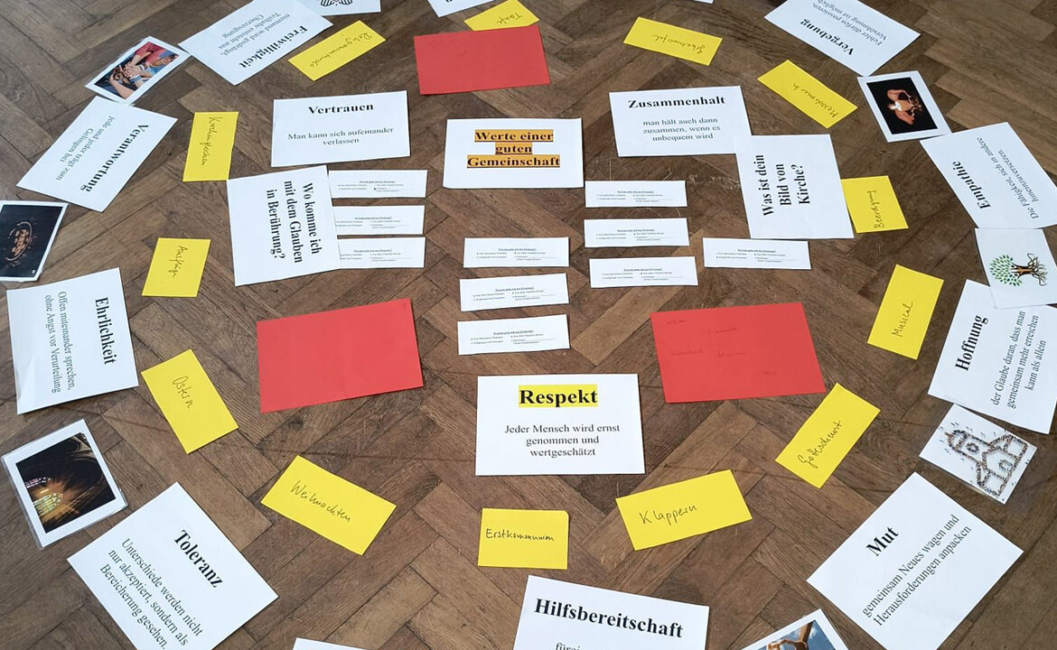 Während der gesamten Firmstunde entstand in der Mitte des Raumes gemeinsam ein großes Bodenbild, worin sich auch die Werte einer guten Gemeinschaft widerspiegeln. Begriffe wie Respekt, Vertrauen und Zusammenhalt bildeten oftmals das Fundament, denn jede Gruppe musste sich auf drei Werte einigen, was gar nicht so einfach war, wie sich rausstelle. Der Begriff Kommunikation stach dabei besonders raus, denn ohne diese hätten sich die Jugendlichen gar nicht auf drei dieser Werte einigen können, so einer der Firmlinge. Ergänzt wurden diese Werte durch zentrale Haltungen wie Vergebung, Ehrlichkeit, Toleranz, Hilfsbereitschaft und noch viele mehr. Es wurde deutlich, wie vielfältig und lebendig Gemeinschaft gestaltet werden kann.